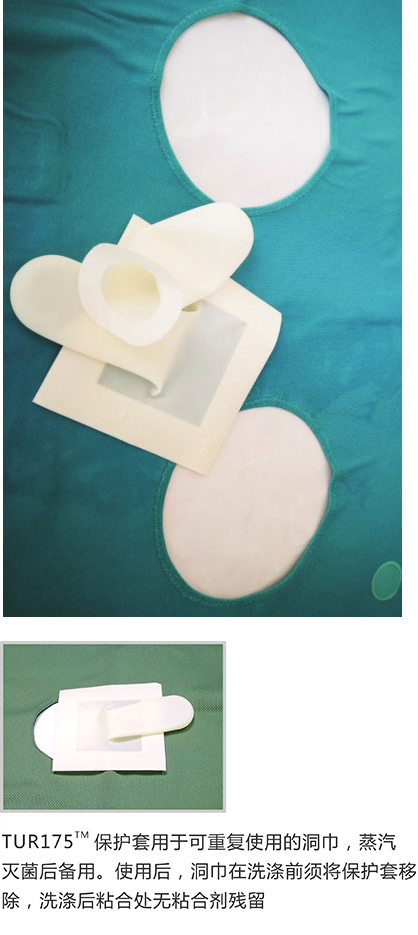 前列腺電切保護套根據(jù)EN ISO 9001和EN ISO 13485標準制造,符合歐洲醫(yī)療器械標準93/42/ EEC的要求。用于TUR手術(經(jīng)尿道前列腺切除術)、前列腺或膀胱手術,洞巾滅菌前保護套預先貼附在手術洞巾的洞口輪廓外圍,與洞巾一同滅菌后使用,保護病人并創(chuàng)造一個無菌和衛(wèi)生的防護屏障。TUR 175TM 保護套是一種無乳膠套,并涂覆100%水溶性膠粘層。保護套耐撕裂,微多孔技術蒸汽可透過,保護套具備彈性。在蒸汽滅菌后,膠粘劑達到最佳粘合強度,以確保洞巾和保護套牢固的粘附力。洞巾使用后粘合劑水洗可溶,洞巾貼合處無殘留。