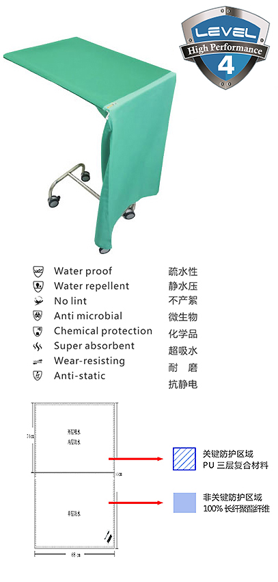 手術(shù)洞巾關(guān)鍵區(qū)域采用FH-PU高防護材料,內(nèi)層微多孔技術(shù)透氣并超強防水,表層吸水防止噴濺液體的滑落或回流。非關(guān)鍵區(qū)域采用PS-BZ-A標(biāo)準(zhǔn)防護材料。
