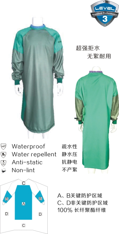 加強防護手術(shù)衣A、B為關(guān)鍵區(qū)域采用PS-JQ-A加強防護材料,C、D為非關(guān)鍵區(qū)域采用PS-BZ-C標(biāo)準(zhǔn)防護材料適用于有一定液體噴濺或噴霧風(fēng)險的手術(shù),如肩關(guān)節(jié)鏡經(jīng)尿道前列腺電切術(shù)、乳腺癌根治術(shù)、剖宮產(chǎn)等