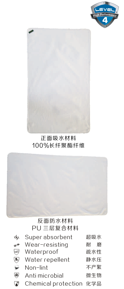 雙層干燥墊正面整體區(qū)域采用XS - A吸水耐磨功能材料,反面整體區(qū)域采用FH-PU高防護功能材料。用于醫(yī)療設備清潔擦拭、醫(yī)療院所環(huán)境清潔、內(nèi)鏡消毒檢查臺雙層干燥墊。